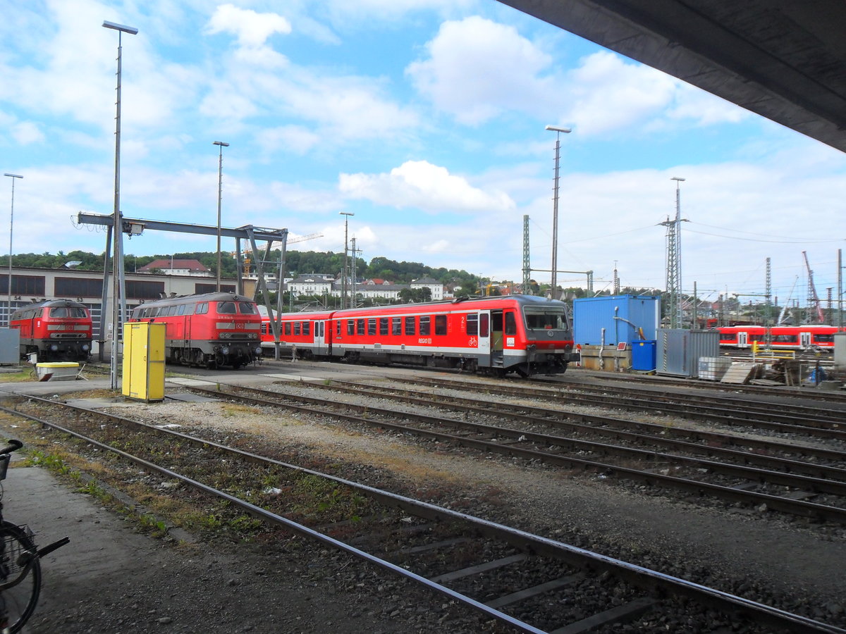 628 905 218 412 und 218 427 abgestellt vor einer Fahrzeughalle im Ulmer Hauptbahnhof. Das Bild entstand von der öffentlich zugänglichen Schillerstraße in Ulm, wo man nahezu perfekte Sicht auf die Fahrzeughalle hat. 15.06.16