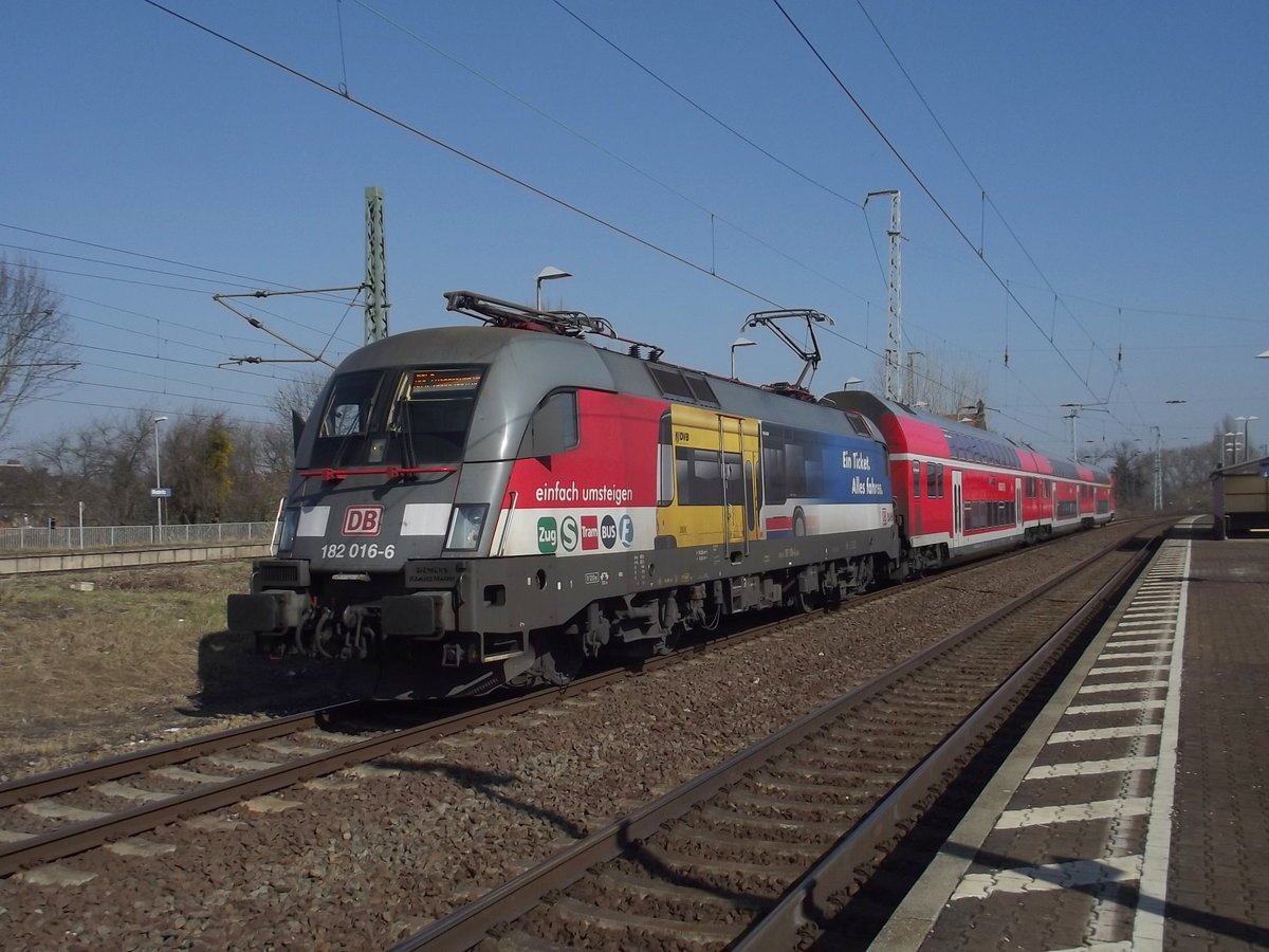 Die Regionalbahn 17110 aus Leipzig-Connewitz nach Magdeburg gezogen von 182 016 - 6 am 17.Märtz 2016 in Biederitz