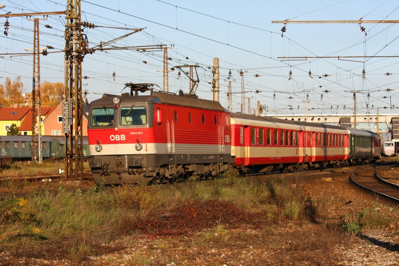 1044 071 mit  Erlebniszug Donau  auf dem Weg nach Passau. Aufgenommen bei tiefem Sonnenstand am 1. November 2007 im Bahnhof Wels.