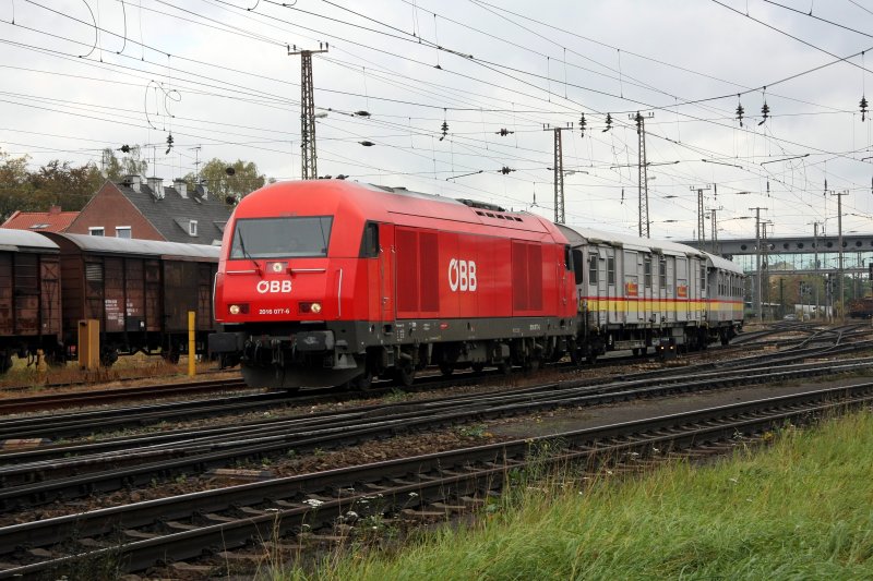 2016 077 mit einem Hilfszug bei der Ausfahrt aus dem Bahnhof Wels in Richtung Passau. Wenig später kehrte er mit einem (anscheinend defekten) Waggon wieder nach Wels zurück. Aufgenommen am 20. Oktober 2007.