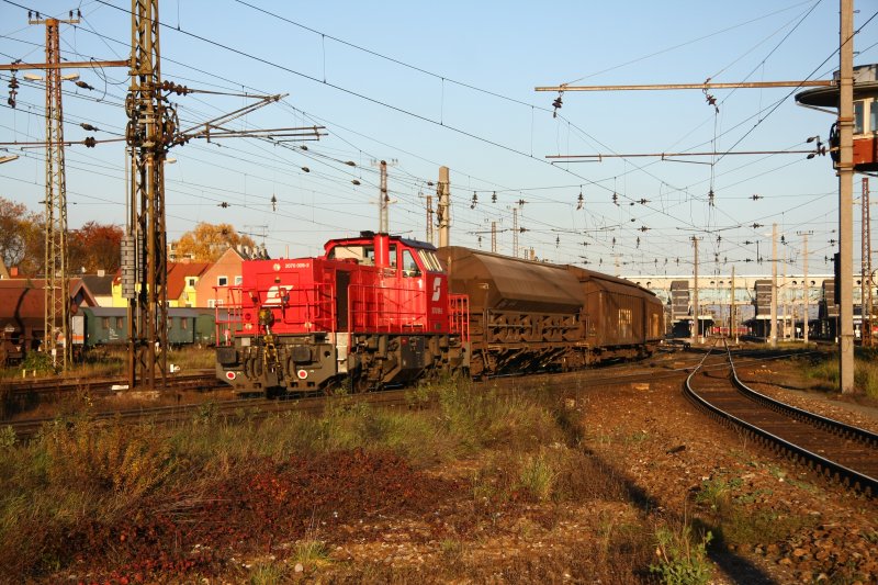 2070 009 mit einem kurzen Güterzug bei der Ausfahrt aus dem Bahnhof Wels in Richtung Passau am 1. November 2007.