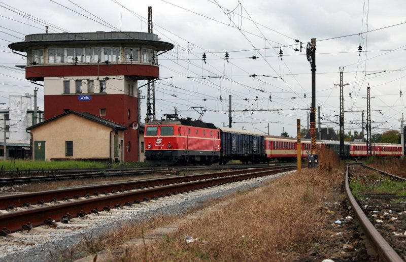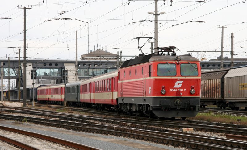Ankunft der 1044 120 mit dem Erlebniszug Donau im Bahnhof Wels. Dieser Zug pendelt mehrmals täglich zwischen Linz und Passau. Aufgenommen am 13. Oktober 2007.
