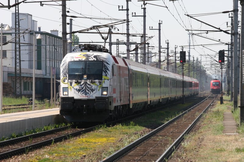 Bundesheertaurus 1116 246 mit EC 563 bei der Einfahrt in den Bahnhof Wels am 28. April 2007.