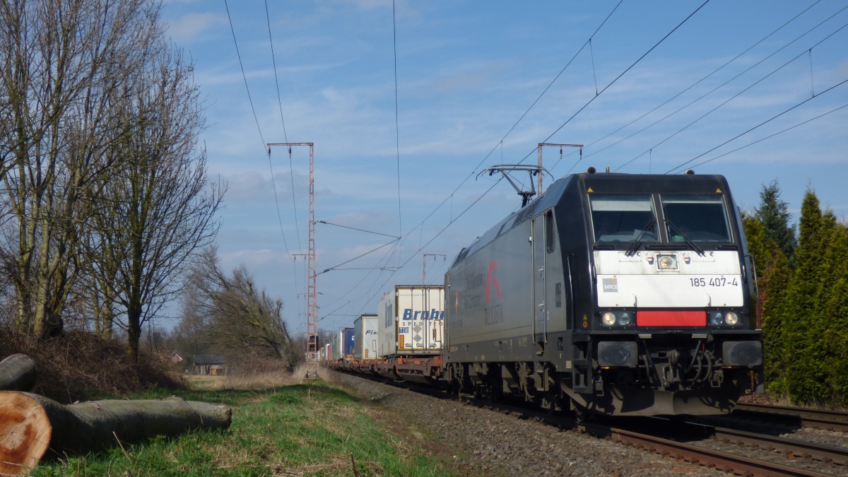 Am 23.03.17 war die TXL 185 407 mit ihrem KV von Malmö unterwegs nach Wanne-Eickel. Hier passiert sie gleich den Bahnübergang von Speckhorn.