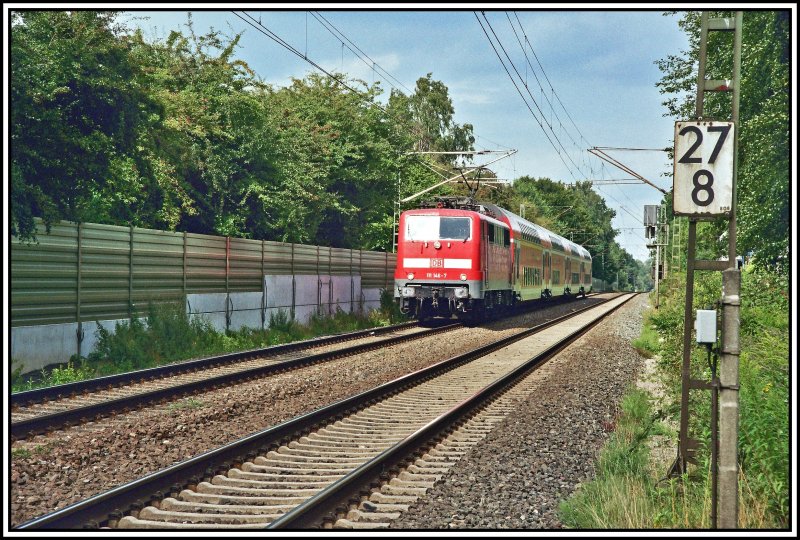 111 146 fährt mit einen RE2 "RHEIN-HAARD-EXPRESS" bei Haltern am See zum Ziel Mönchengladbach. Aufgenommen im Herbst 2005