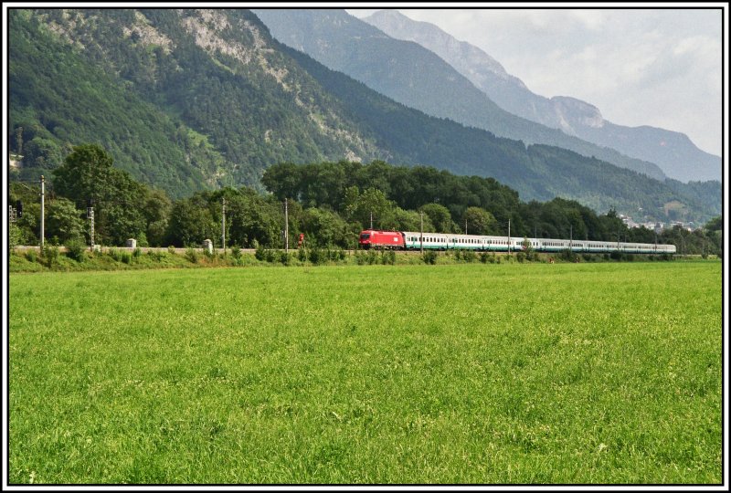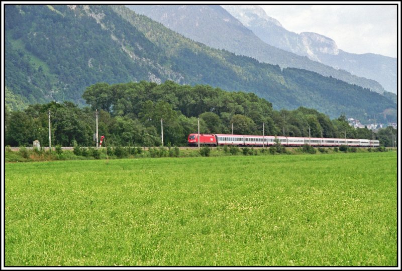 Eine 1116 rasst mit dem OEC160 "Maria Theresia" von Wien West nach Zürich HB. Aufgenommen am 17.06.05 bei Stans b. Schwaz.
