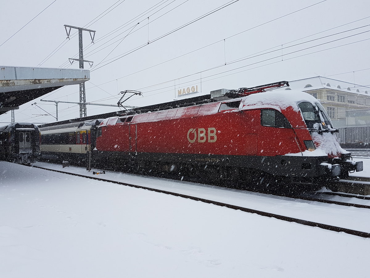 Seit Fahrplanwechsel werden die IC zwischen Singen und Stuttgart alle 2 Stunden mit ÖBB-Taurus bespannt. Das Bild zeigt die verschneite 1116 275-9 am 10. 12. 2017 in Singen.
