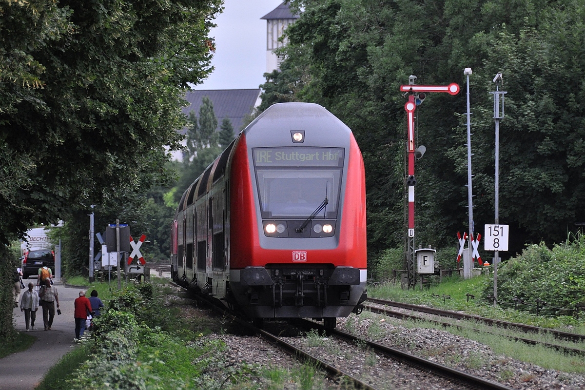 Ein IRE nähert sich dem Zielbahnhof Lindau und hat soeben den Bahnübergang Hasenweidweg passiert (01.07.2012).