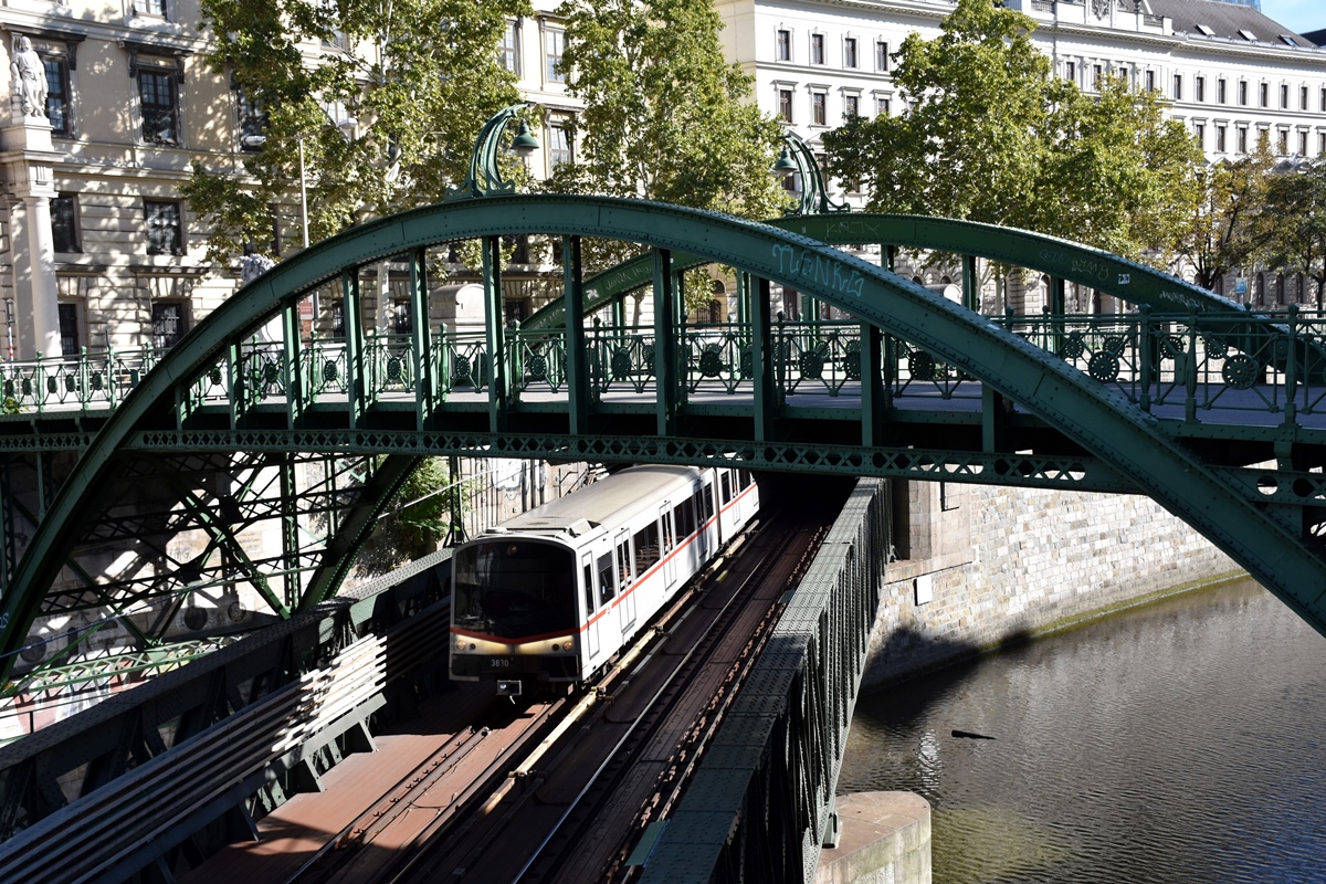 Wagen 3830 der Wiener Linien überquert als U4 am 26.09.2018 den Wienfluss bei der Zollamtsbrucke (zwischen den Stationen Landstraße und Schwedenplatz).