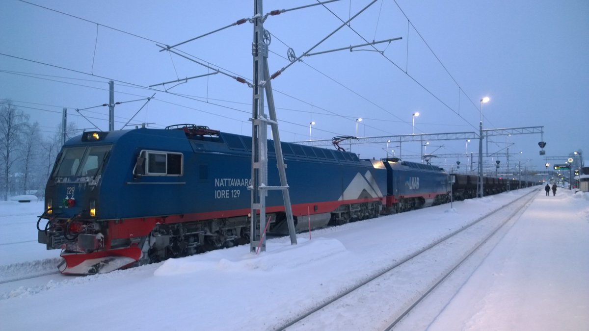 Ein leerer Erzzug mit IORE 129/133 Nattavaara/Kopparåsen wartet am 27. Dez. 2017 gegen 13 Uhr im Bf Gällivare auf die Zugkreuzung mit dem Norrtåg 7152 Luleå-Kiruna. Anna Catarina Mueller