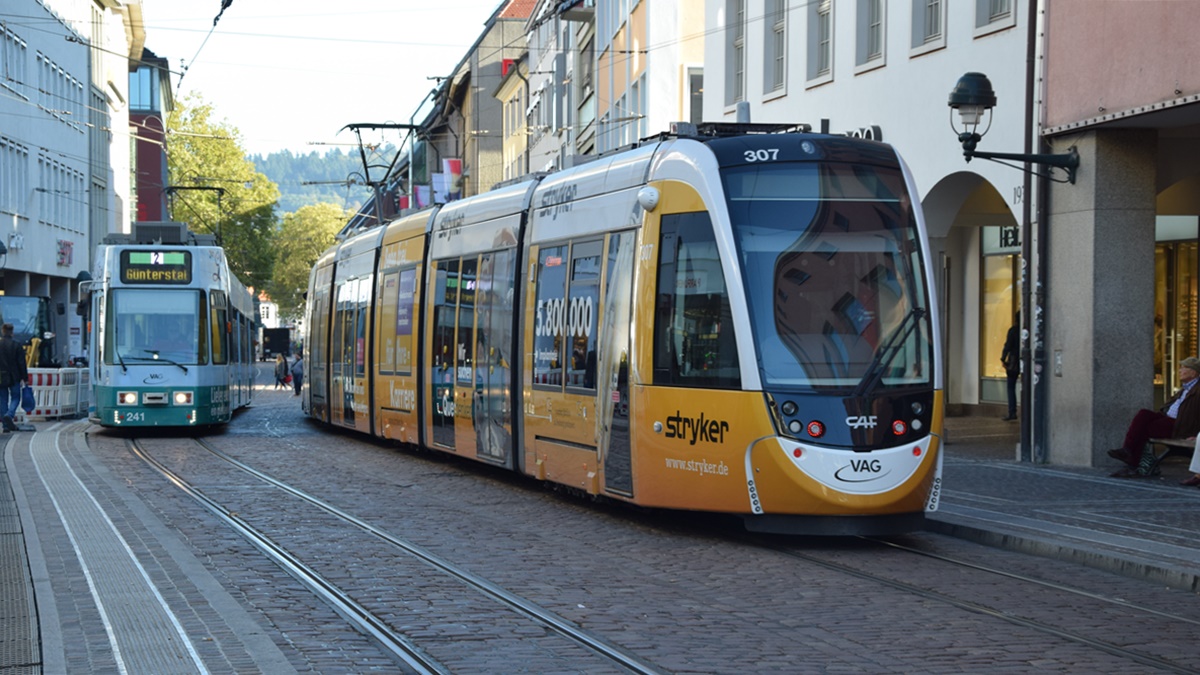 Freiburg im Breisgau - Straßenbahn Düwag 241 und CAF Urbos 307 - Aufgenommen am 13.10.2018