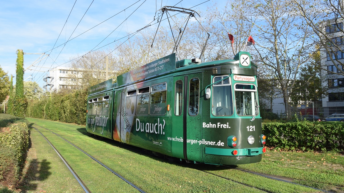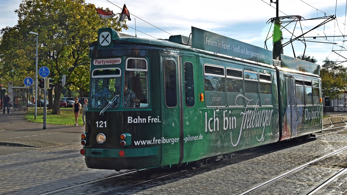 Freiburg im Breisgau - Straßenbahn Maschinenfabrik Esslingen GT4 (Partywagen Nr. 121) Aufgenommen am 12.10.2018