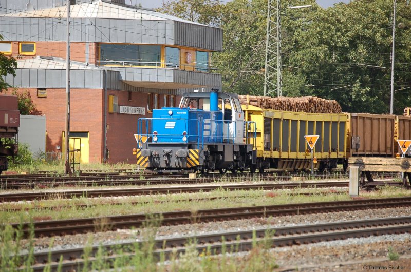 D 03 mit einem Holzzug aus Kronach im Bhf Lichtenfels in dem fast alle Gleis auf 40 begrenzt sind. 13.07.07