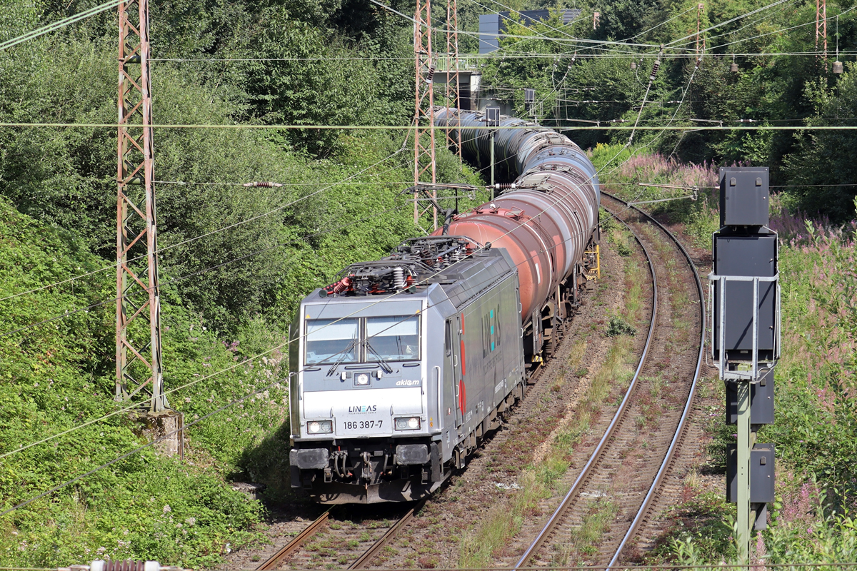 Akiem 186 387-7 in Diensten von Lineas auf der Hamm-Osterfelder Strecke in Recklinghausen-Ost 6.8.2024