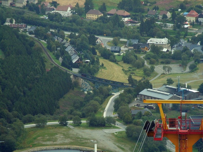 Blick vom Fichtelbergaussichtsturm auf die Bahnhofsausfahrt Oberwiesenthal.(13.08.2009)