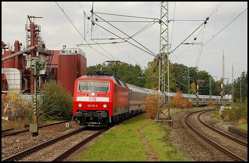 Die 120 132 ist mit dem IC 2066 nach Karlsruhe Hbf unterwegs. Aufgenommen am 08.Oktober 2008 in Goldshöfe.