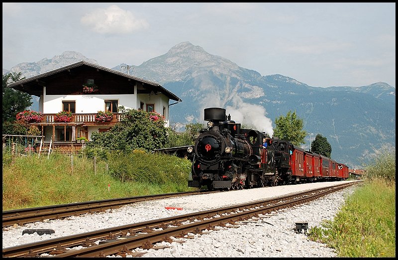 Österreichurlaub 2008 - Zillertalbahn: Der Dampfzug nach Mayrhofen. Aufgenommen in Schlitters(i.Z.) am 03.September 2008