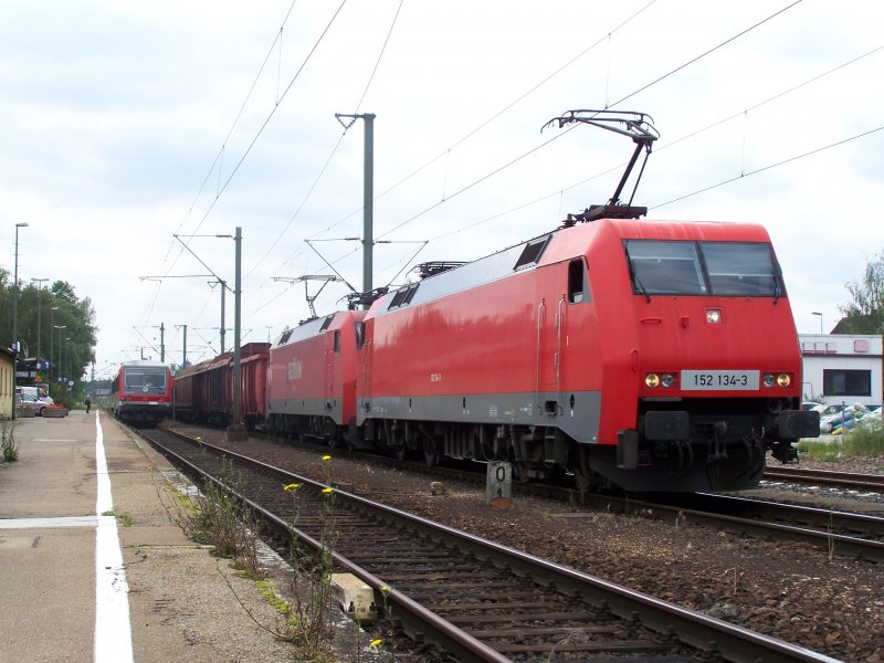 Am 31.Mai.07 fuhr diese Doppeltraktion der Br.152 mit einem GüterZug GZ. Hier vor einem Rotem Signal im Bahnhof Crailsheim. Eine der Beiden 152er ist die Br.152 134-3.