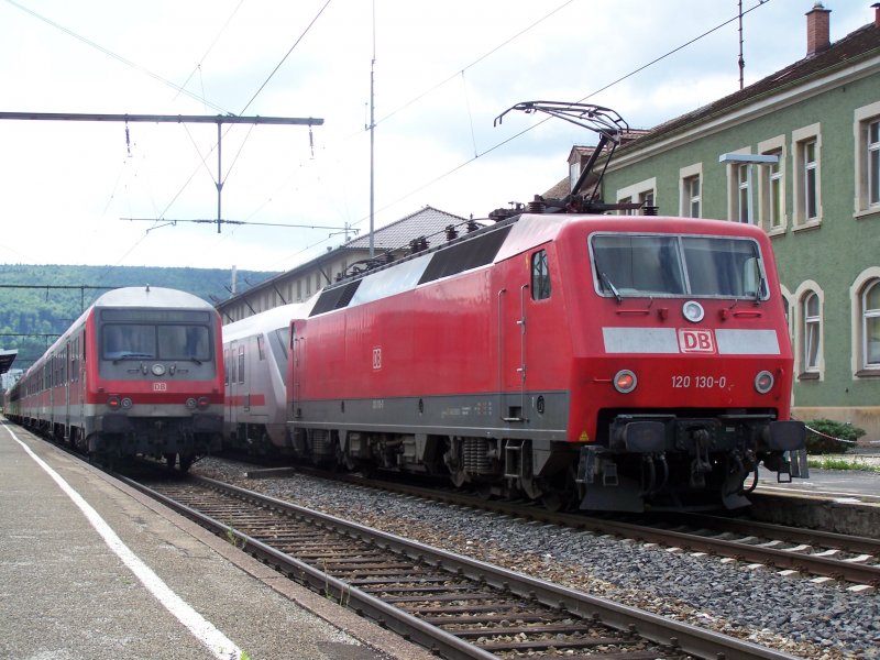 Die Br.120 130-0 fuhr am 30.Mai.07 als IC-Steuerwagen-Ersatz mit dem IC von Nürnberg Hbf nach Karlsruhe Hbf, am Zuganfang hing eine Br.101. Aufgenommen im Bahnhof Aalen.