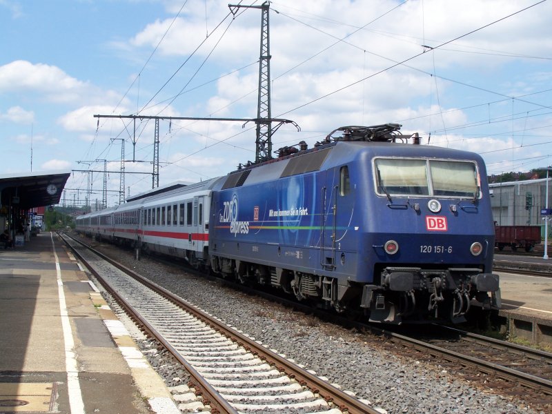 Die Br.120 151-6  ZDF-Express  fuhr am 30.05.07 mit dem IC von Nürnberg Hbf nach Karlsruhe, hier im Bahnhof Aalen.