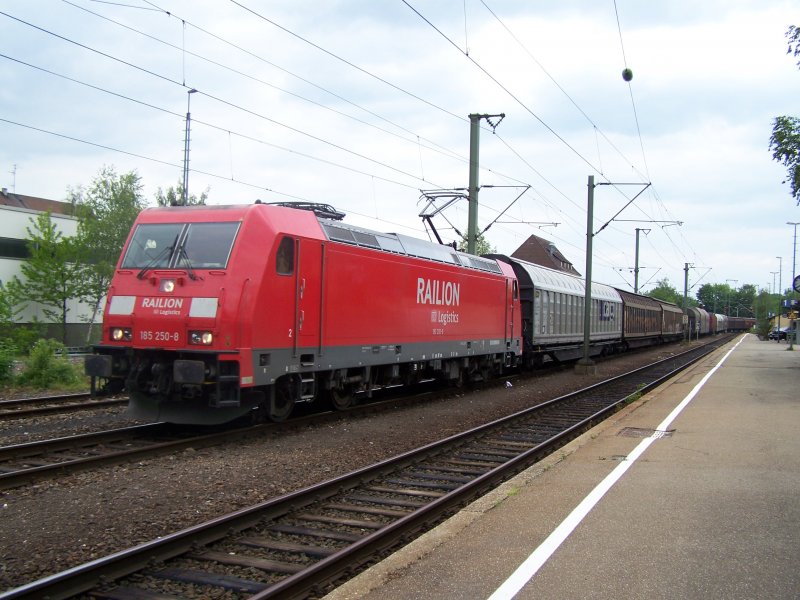 Die Br.185 250-8 fuhr am 31.Mai.07 mit einem Güterzug GZ durch den Bahnhof Crailsheim. Vermutlich nach Kornwestheim RBF.