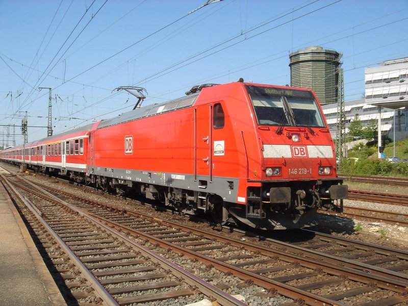Die Br.146 219-1 bei der Ausfahrt in Aalen. Dieser RE-Zug fuhr nach Stuttgart Hbf. Aufgenommen am 26.04.06 in Aalen Hbf.