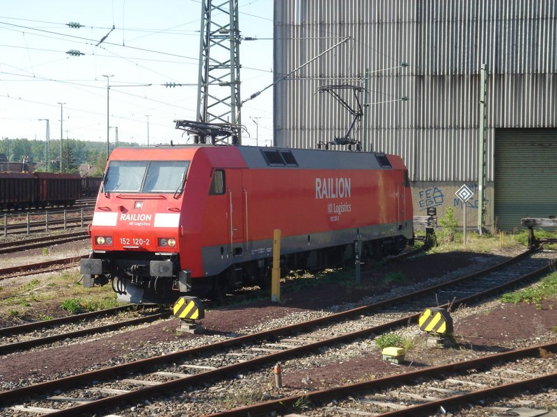 Die Br.152 120-2 stand am 26.04.06 auf dem Abstellgleis in Aalen Hbf. Der Stromabnehmer war schon ausgefahren und die Lichter an, jetzt wartete sie nur noch auf Freiefahrt, um ihren Güterzug, der hier im Bild links stand, aufzunehmen um dan mit diesem Güterzug nach Kornwestheim Gbf zu fahren, wo er dort schließlich in mehrere Güterzüge verteilt wurde und in Verschiedene Richtungen fuhr.
