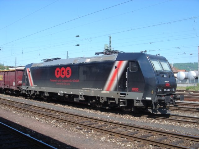 Diese Br.185 stand am 26.04.06 in Aalen abgestellt. Sie trug eine Werbelackierung für TCS Transport- und Cargoservice Gmbh. Sie ist stationiert gewesen im BW Uelzen. Die Osthannoversche Eisenbahn Ag fährt nur vorübergehen in Aalen ein.