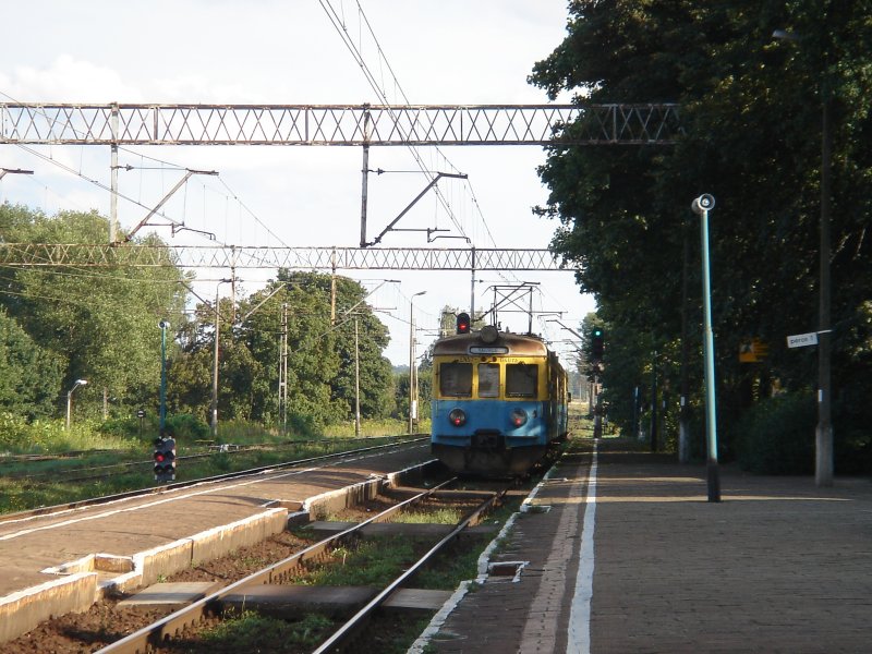 Dieser Triebzug der Baureihe EN57 fuhr am 31.08.06 aus dem Bahnhof von Olseno aus. Eigentlich sieht es ja so aus, als ob die Strecke sillgelegt wäre, denn das Gras wuchert schon über die Gleise hindrüber, aber dies ist die Hauptstrecke in dieser Region:-).