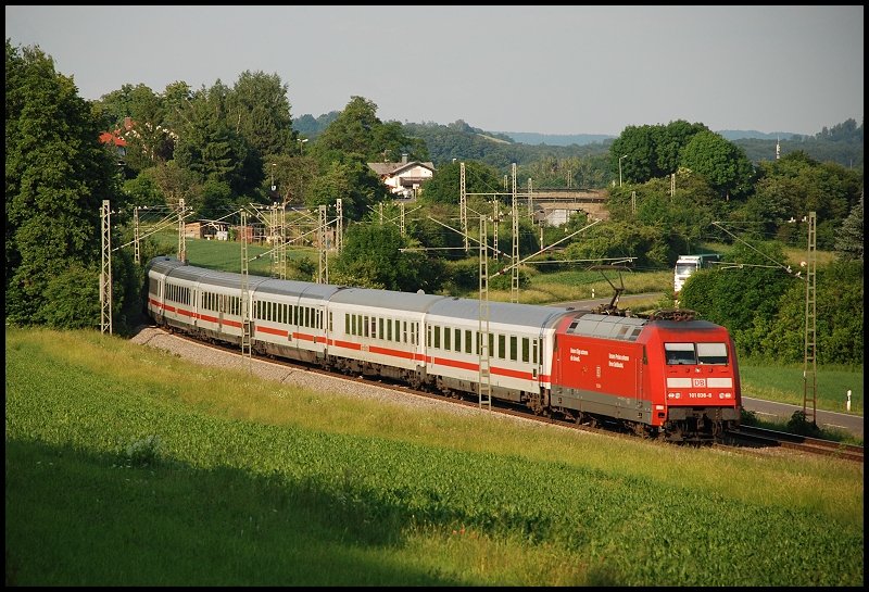 101 038 ist nach Karlsruhe Hbf unterwegs. Aufgenommen im Juni 2008 bei Mögglingen.