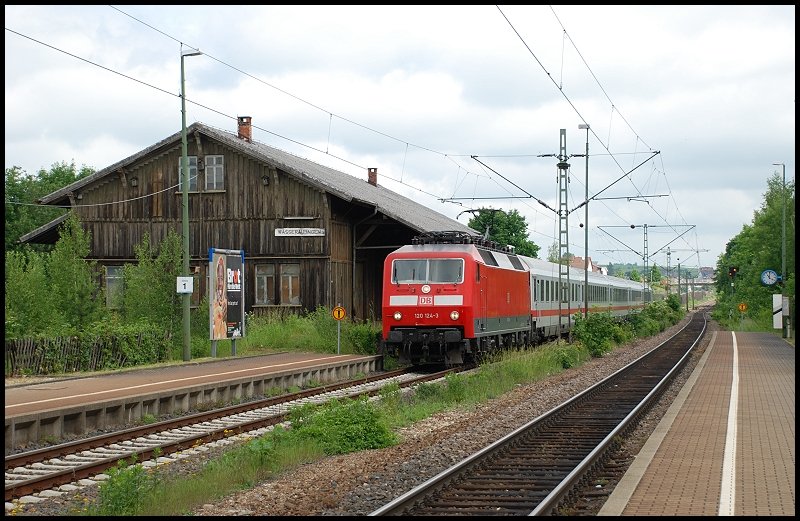 120 124 ist in Richtung Karlsruhe Hbf unterwegs. Aufgenommen im Mai 2008 in Aalen-Wasseralfingen.