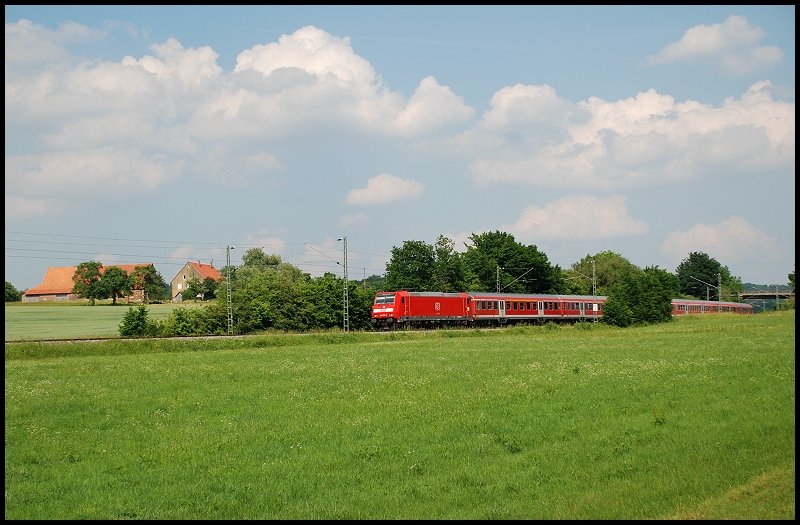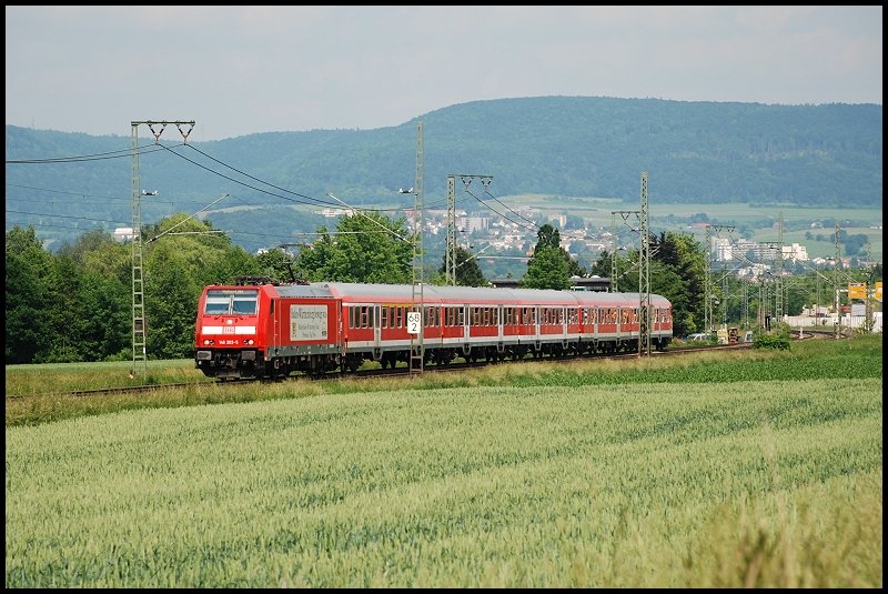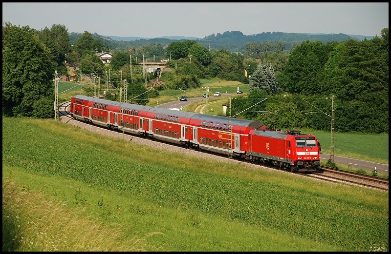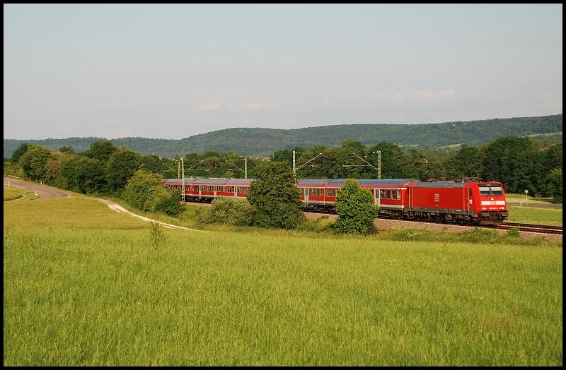 Eine 146er ist mit einem regionalExpress nach Stuttgart Hbf unterwegs. Aufgenommen im Juni 2008 bei Mögglingen.
