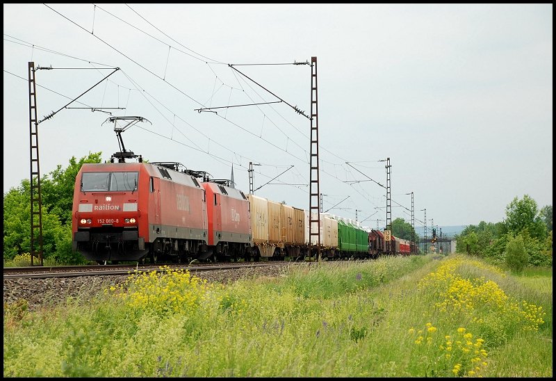 152 080 zieht eine weitere 152er und einen gemichten Güterzug in Richtugn Gemünden. Aufgenommen im Mai 2008 bei Thüngersheim.