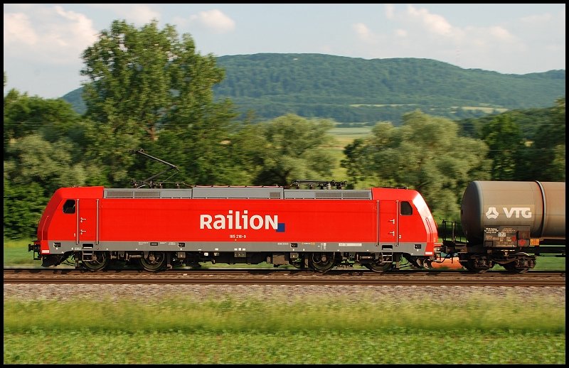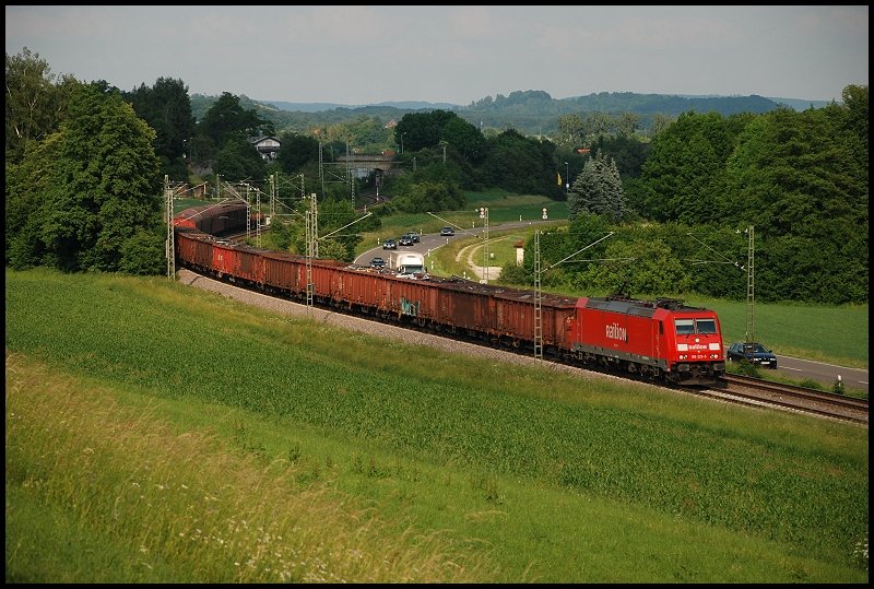185 216 ist mit einem Öler in Richtung Aalen unterwegs. Aufgenommen als Mitzieher im Juni 2008 bei Mögglingen.
