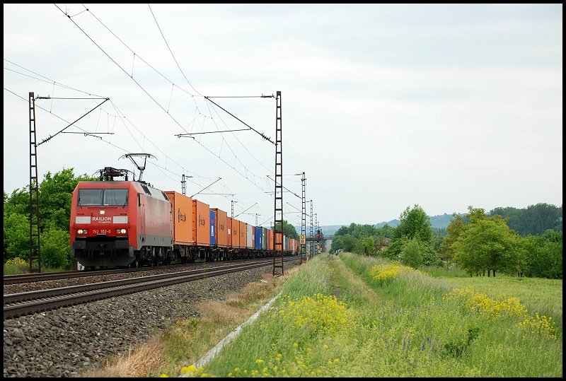 Eine 152er ist mit einem Containerzug in Richtung Gemünden unterwegs. Aufgenommen im Mai 2008 bei Thüngersheim.