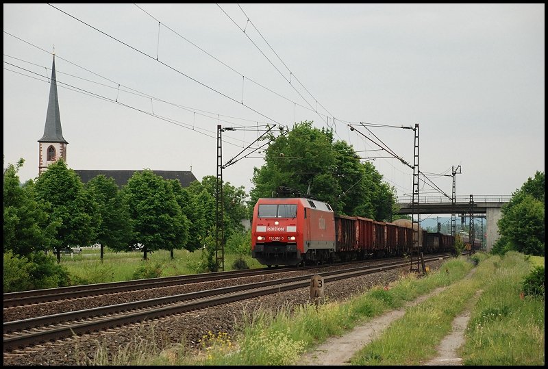 Eine 152er ist mit einem Güterzug in Richtung Gemünden unterwegs. Aufgenommen im Mai 2008 in Thüngersheim.