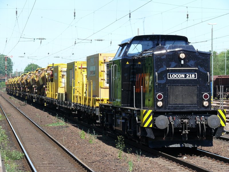 Locon 218 mit Schweerbau-Bauzug. Düsseldorf-Rath. 23.05.2009.
