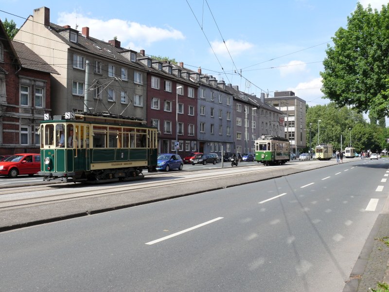 Parade der Straßenbahnoldtimern, v.l.n.r: Wg. 25 Strassenbahn Oberhausen, Wg. 144 Essener Strassenbahn, Wg. 96 Bochum-Gelsenkirchener Strassenbahnen A.G., Wg. 322 Betriebe der Stadt Mühlheim an der Ruhr. Tag der offenen Tür , Straßenbahnbetriebshof Gelsenkirchen. 10.05.2009.