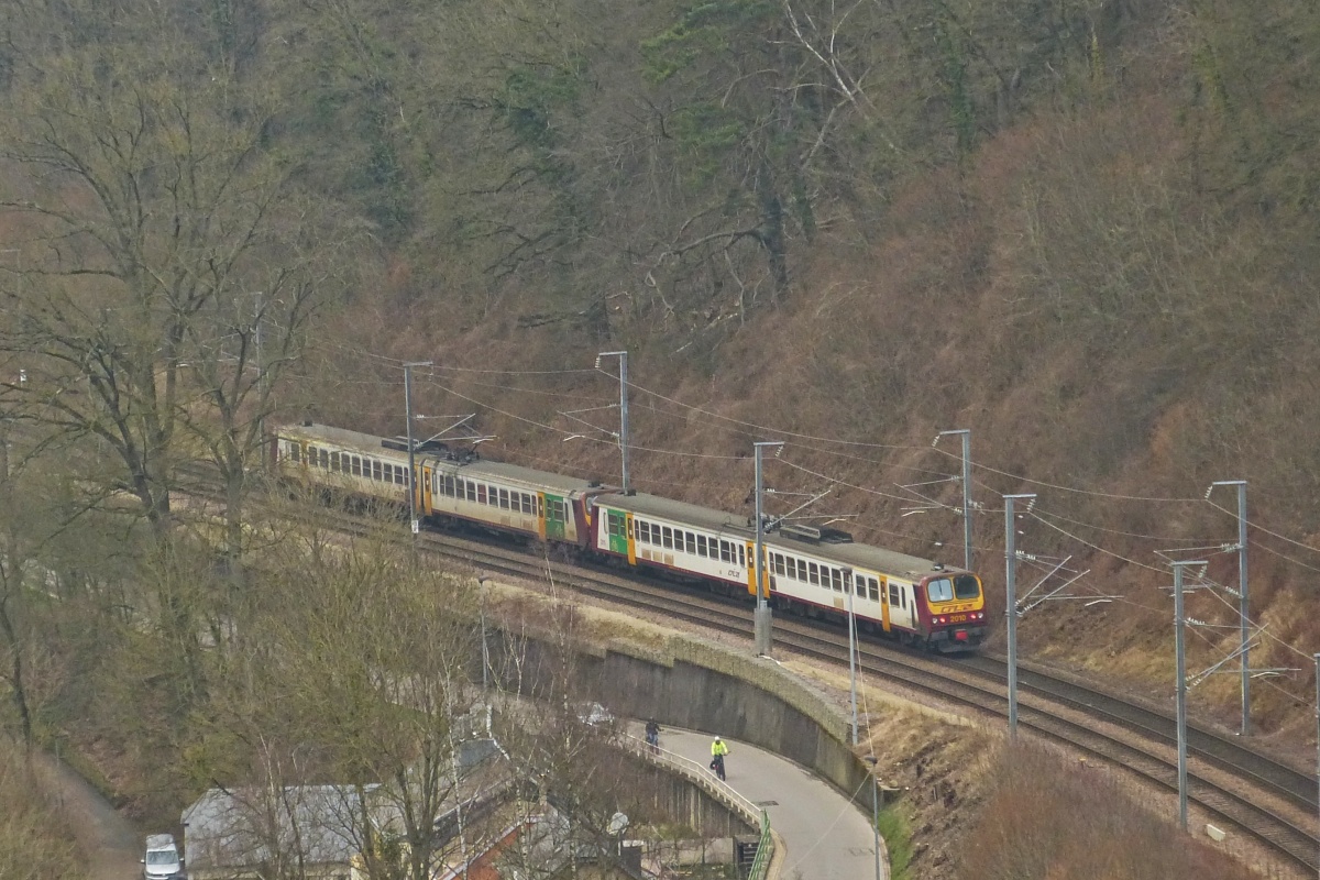 SNCB Desiro 08547, auf der eingleisigen Strecke zwischen Troisvierges und Clervaux unterwegs in Richtung Luxemburg. Gruß an den netten Fahrzeugführer. 03.2025