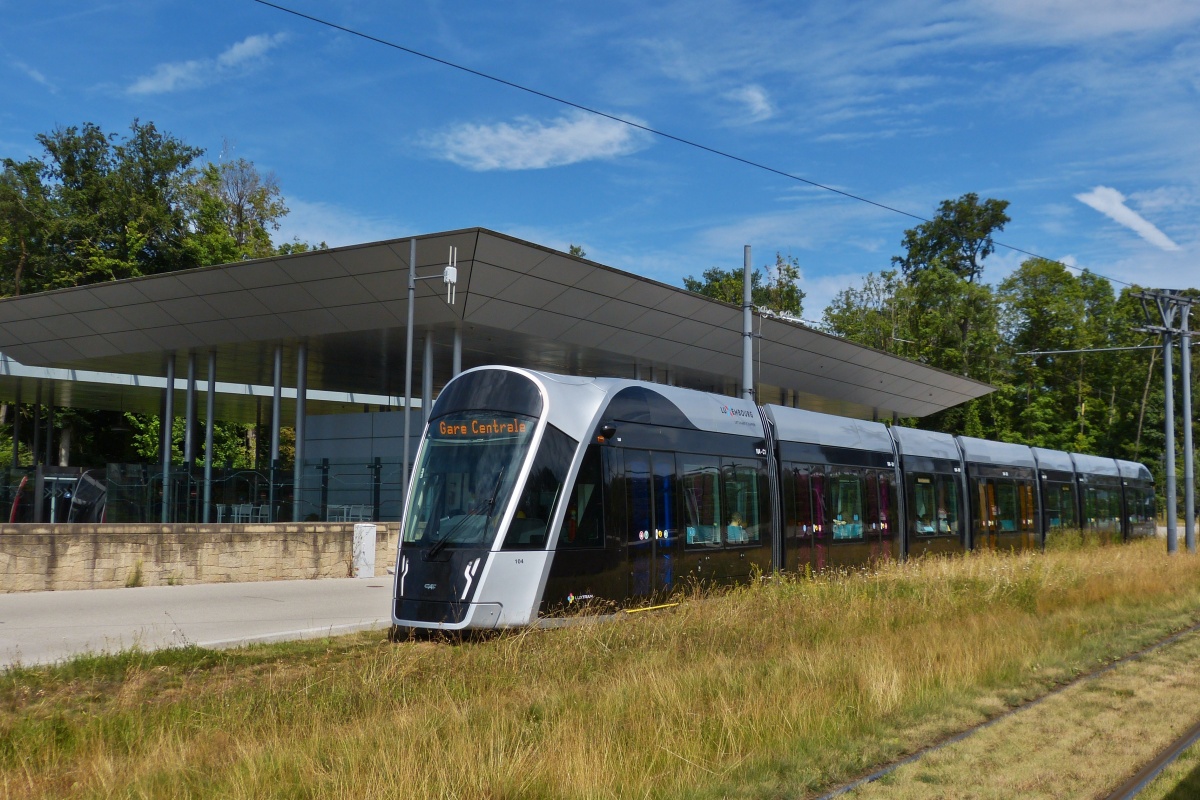Tram 111 nähert sich der Haltestelle Alphonse Weicker auf dem Kirchberg in Luxemburg. 16.06.2025