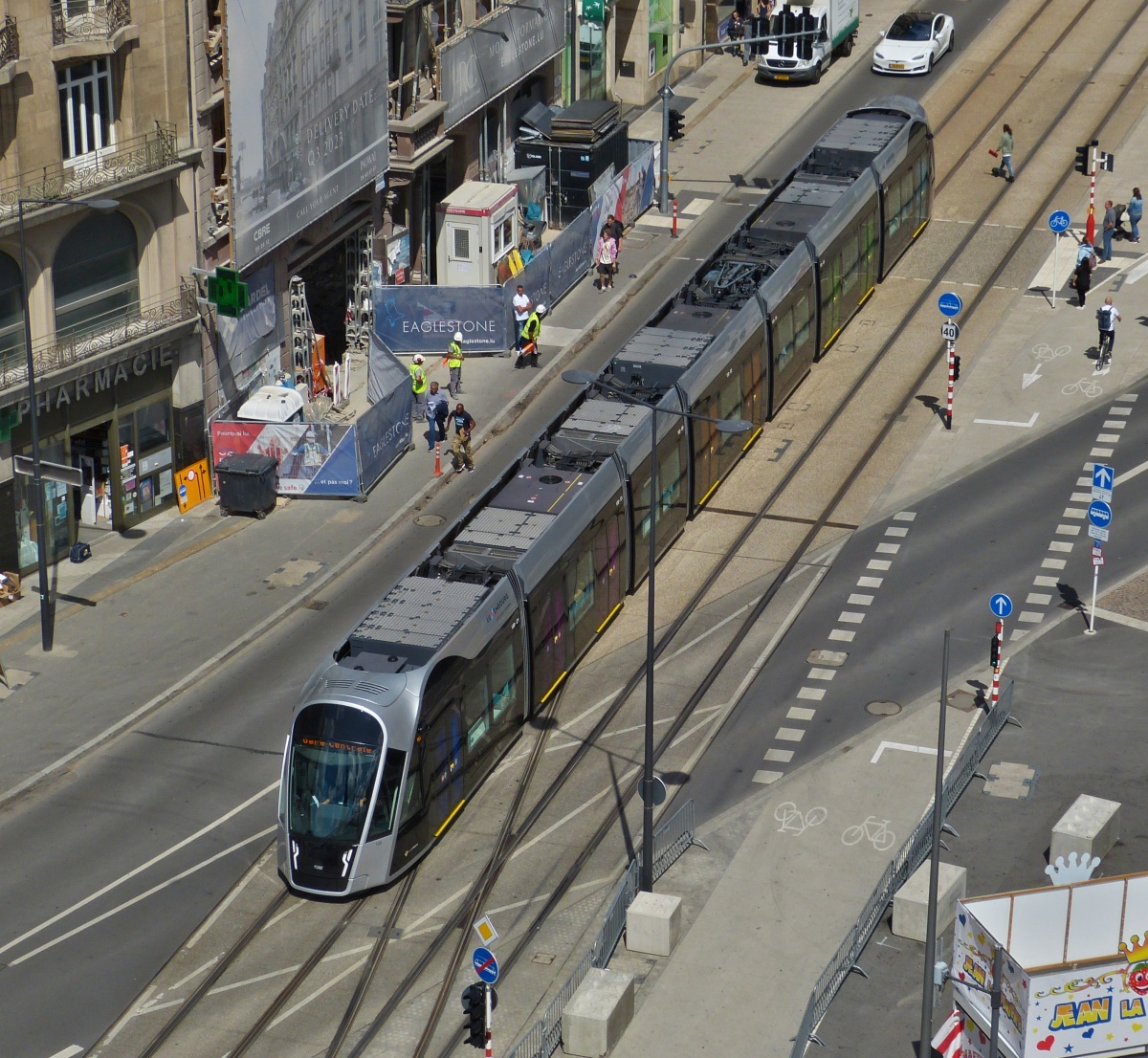 Tram 106, hat soeben eine viel befahrene Kreuzung an der Stäreplaz überquert und fährt in Richtung Hamilius, der Haltestelle im Zentrum der Stadt Luxemburg. 04.2025