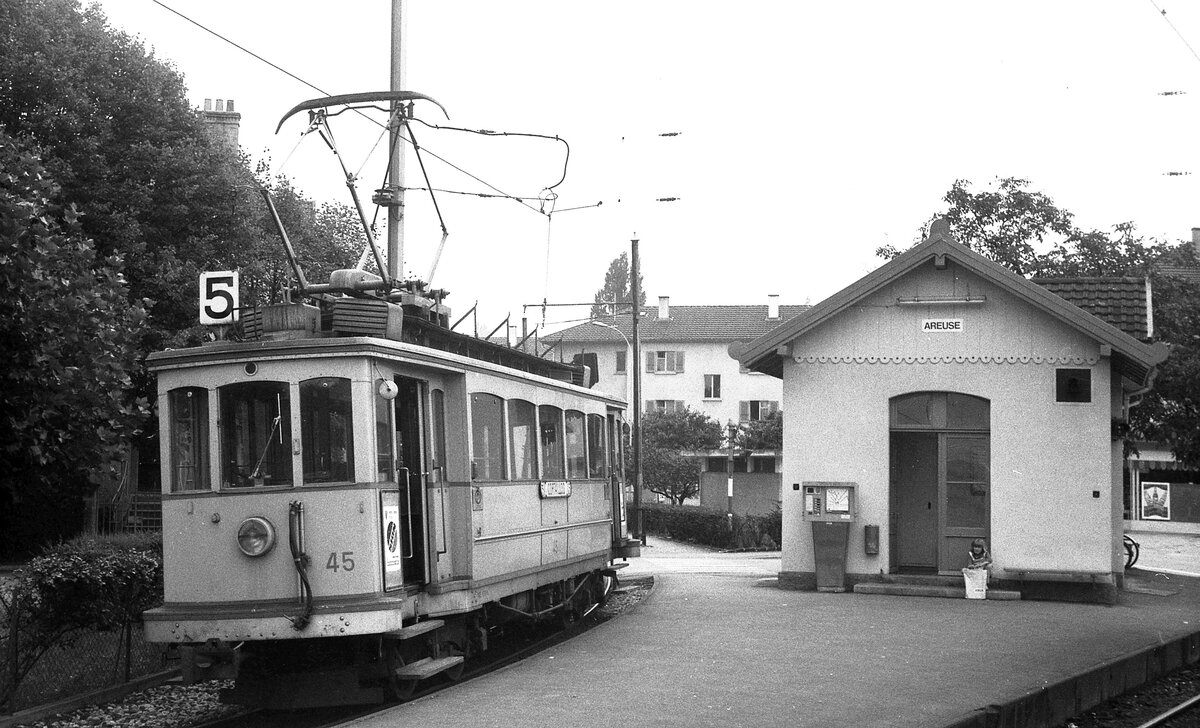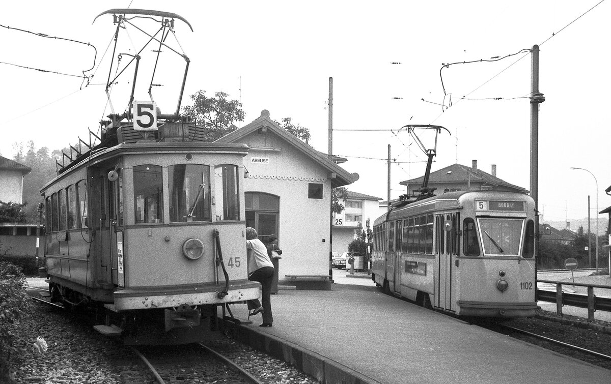 TN__Neuchâtel/Neuenburg__Anschluß in Areuse: Tw 45 solo bedient (auch als Linie 5) die ca. 800 Meter lange Stichstrecke von Areuse nach Cortaillod. Der ex Genua Tw 1102 von Neuchâtel kommend fährt weiter nach Boudry.__30-08-1976 Klaus-Erich Lisk