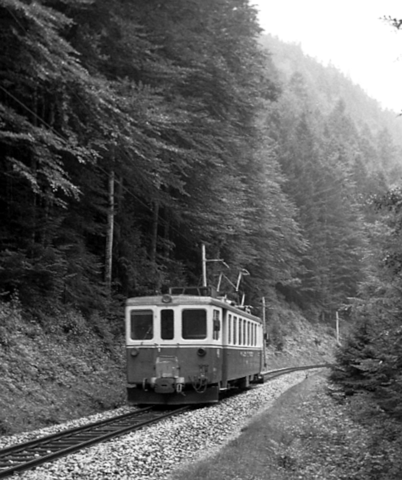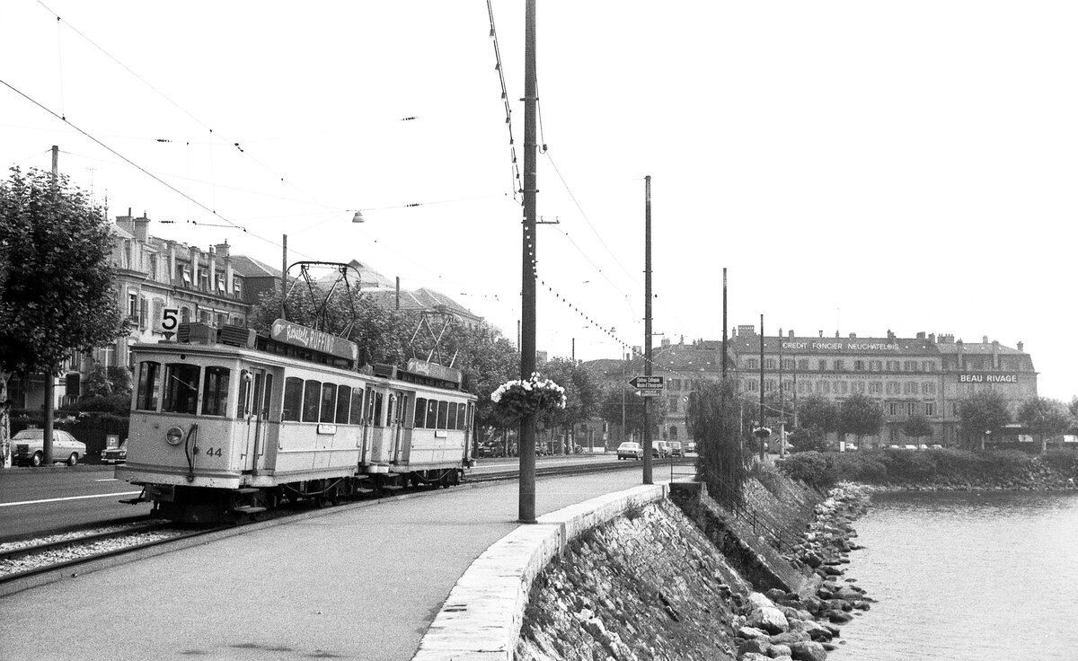 TN__Neuchâtel/Neuenburg__Anschluß in Areuse: Tw 45 solo bedient (auch als Linie 5) die ca. 800 Meter lange Stichstrecke von Areuse nach Cortaillod.__30-08-1976 Klaus-Erich Lisk