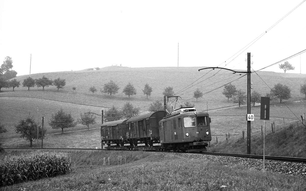 VBW Vereinigte Bern-Worb-Bahnen__Triebwagen Fe 4/4 105 (ex 60) Bj 1959 der Vereinigten Bern-Worb-Bahnen (VBW) mit zwei N-Spur G-Wagen auf Rollwagen.__27-08-1976 Klaus-Erich Lisk