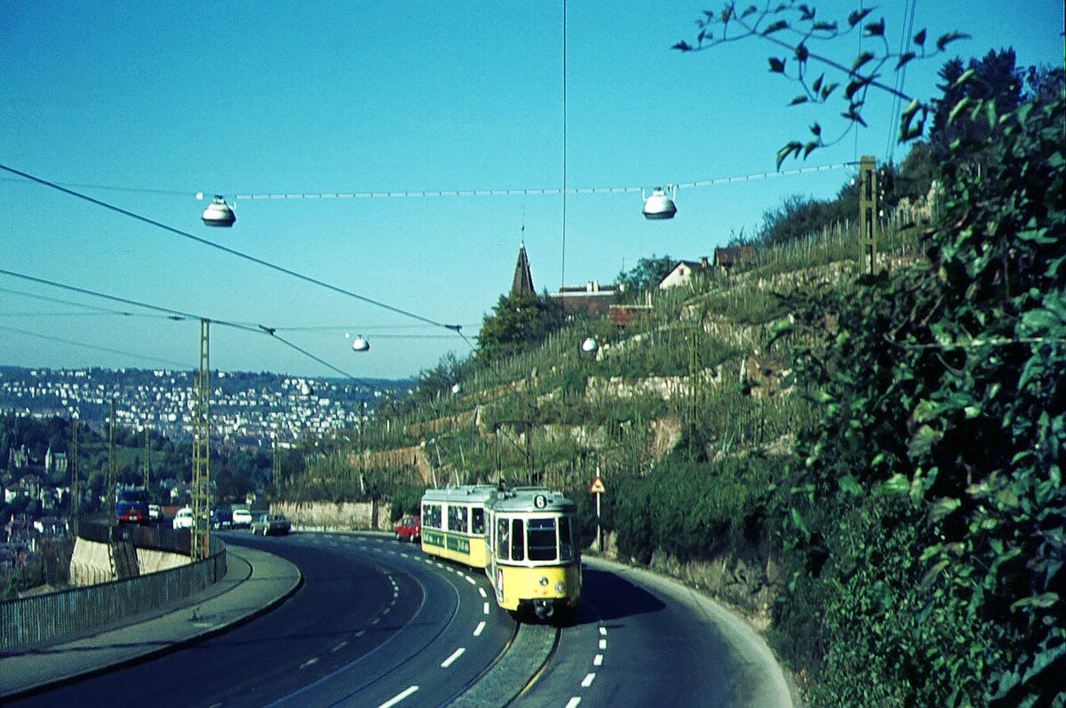 SSB Stuttgart__Von der Straßenbahn zur Stadtbahn__Die (Tunnel-)Strecke nach Degerloch. Landschaftlich wunderschön und mit einmaligem Panorama: die Bergstrecke vom Stadtzentrum nach Degerloch üer die Neue Weinsteige. Aber, auch kurvenreich und auf der Hangstraße in der Breite begrenzt.__08-1974 Klaus-Erich Lisk