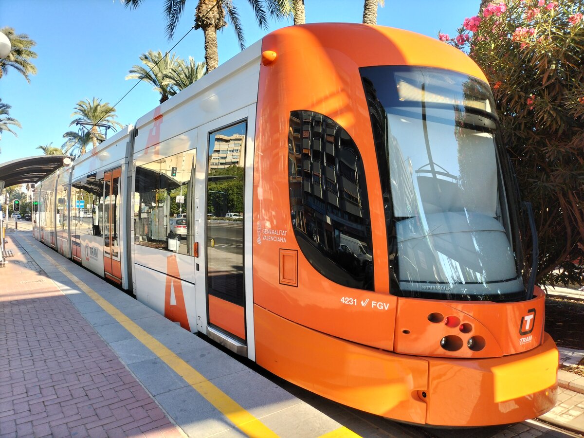 Bombardier Flexity Outlook, Wagen 4231, Ferrocarriles de la Generalitat Valenciana (FGV), wartet an der Endhaltestelle Puerta del Mar in Alicante am 13.11.2023.
