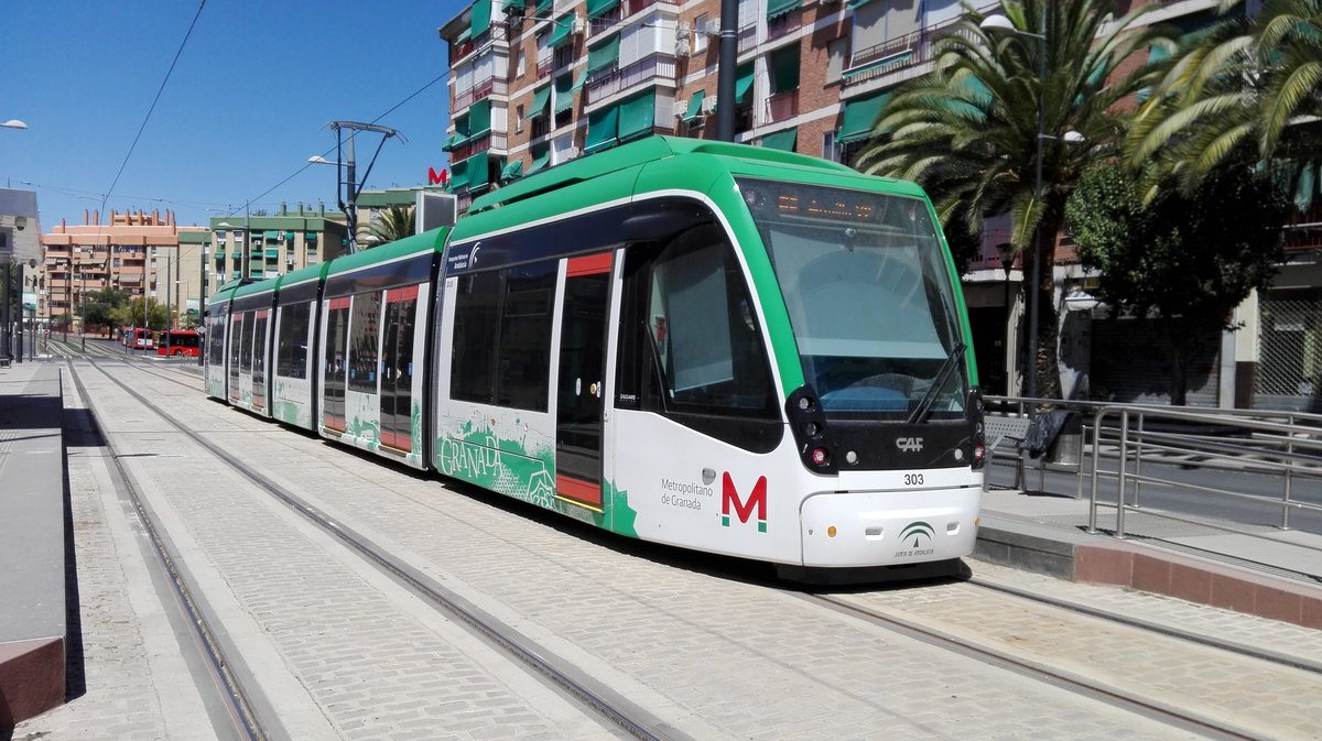 CAF Urbos 3, Wagen 303, Metro Granada, Haltestelle Villarejo, Granada (Spanien), 08.08.2017, in Probefahrt.