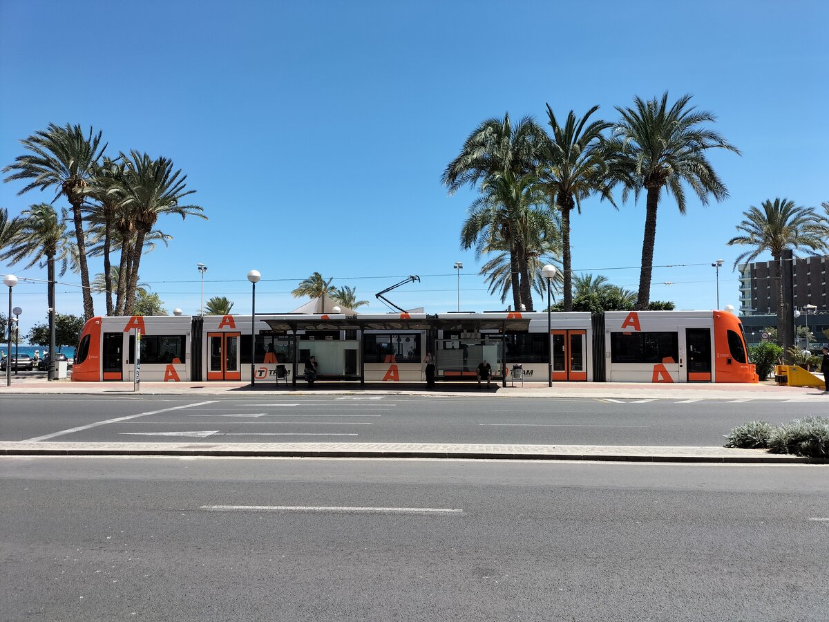 Tram Alicante, Tw 4230, Bombardier Flexity Outlook, Ferrocarriles de la Generalitat Valenciana (FGV), am Plaza Puerta del Mar in Alicante am 15.05.2024