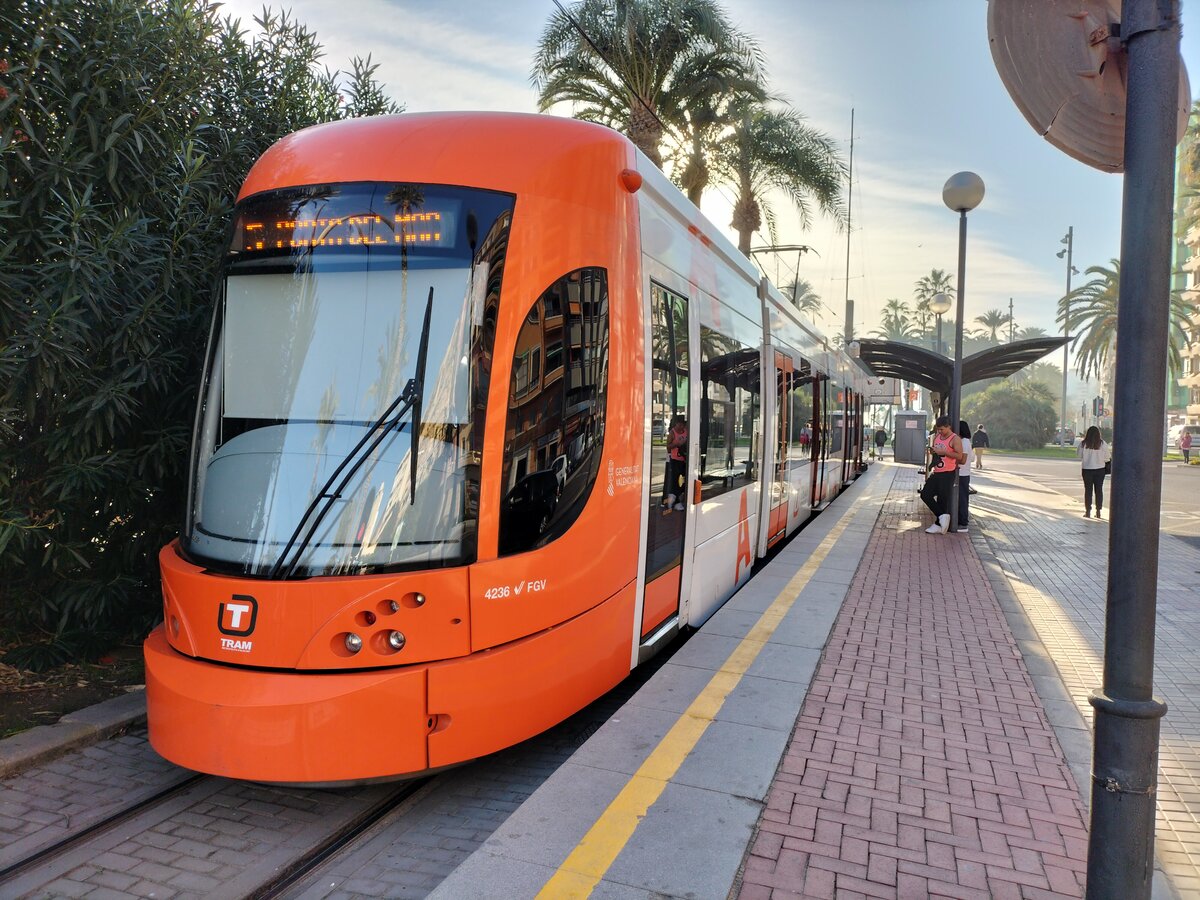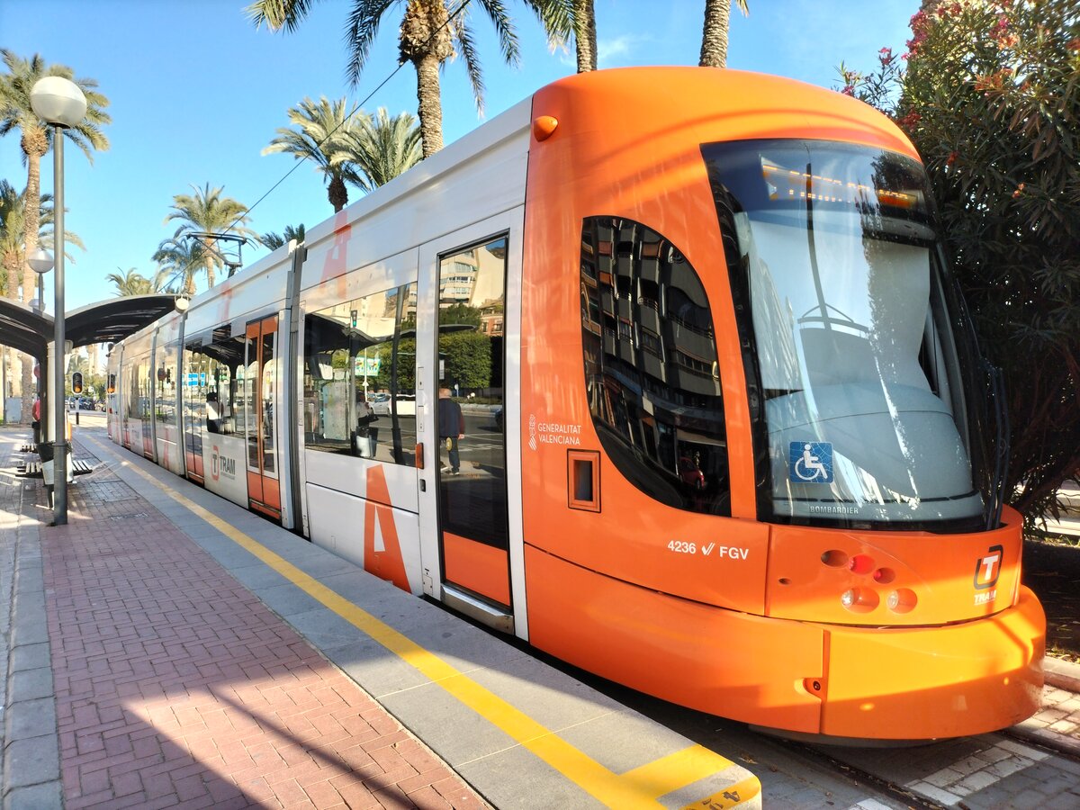 Tram Alicante, Tw 4236, Bombardier Flexity Outlook wartet an der Endhaltestelle Puerta del Mar in Alicante am 12.12.2023
