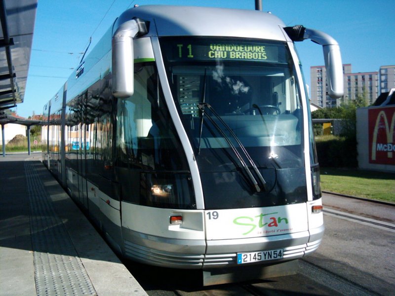 Nancy (F): Bombardier TVR, Wagen 19 an der Endhaltestelle  Essey Mouzimpré . Insgesamt sind 25 Fahrzeuge mit den Wagennummern 1 bis 25 im Einsatz auf der T1-Linie seit Januar 2001. Für die T2-Linie sind 28 Gelenk-Obusse geplant (Eröffnung 2011).